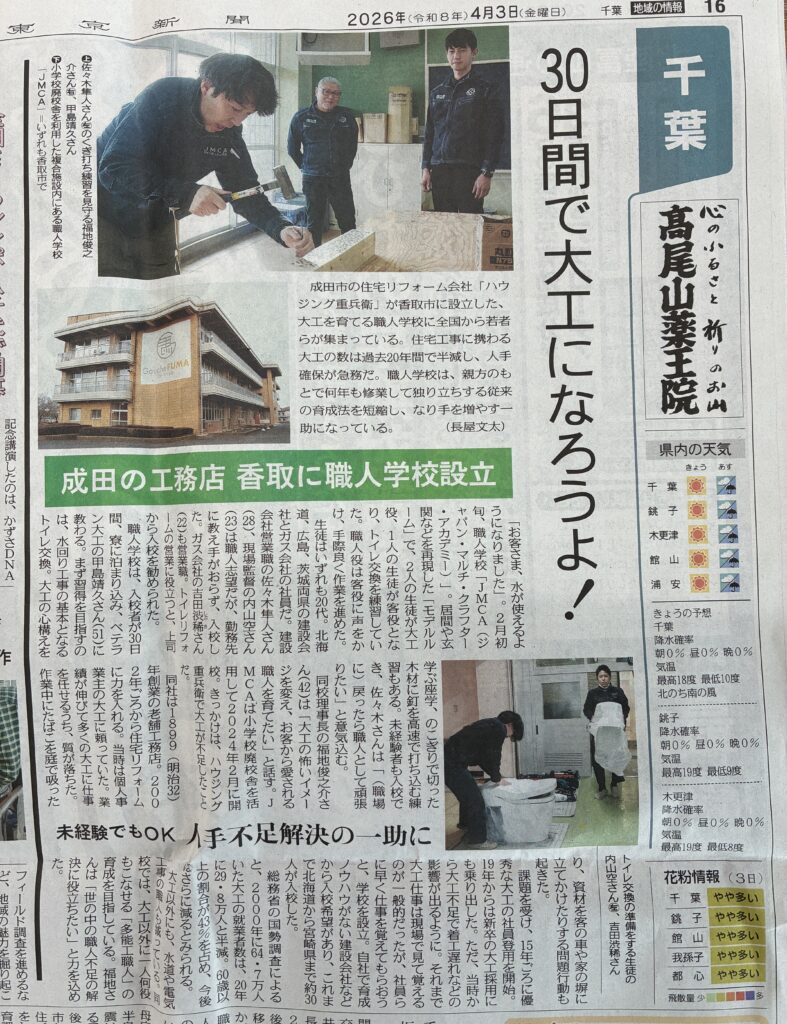 2026年4月3日発行の「東京新聞」にて、弊社事業の多能工職人育成学校JMCAの取材記事が掲載されました!
